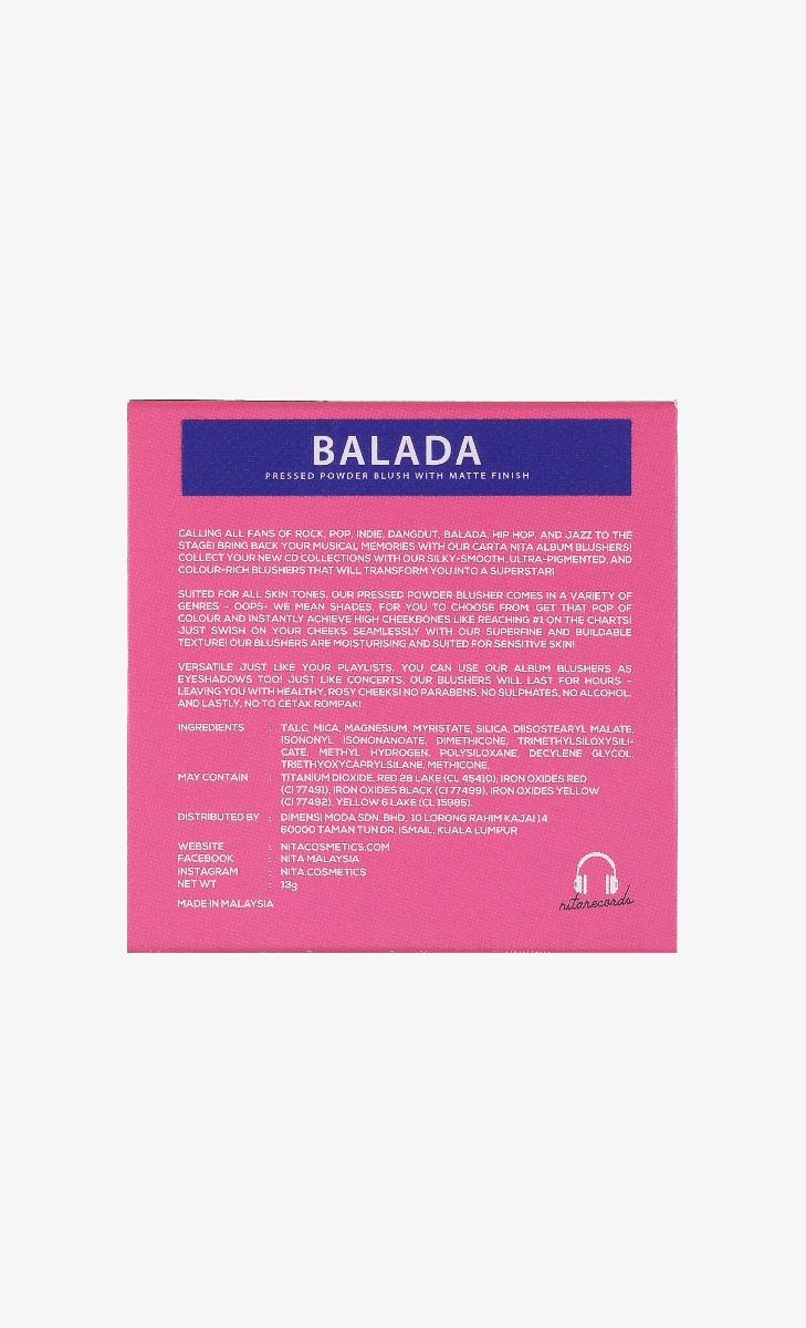 Calling all fans of Rock, Pop, Indie, Dangdut, Balada, Hip Hop, and Jazz to the stage! Bring back your musical memories with our Carta NITA Album Blushers! Collect your new CD collections with our silky-smooth, ultra-pigmented, and colour-rich blushers that will transform you into a superstar!