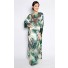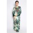 Details include maxi length, round neckline, long sleeves with contrast coloured cuffs, front hook closure and rhinestones embellishment along the neckline.