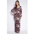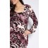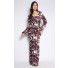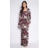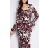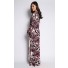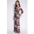 This dress has been crafted from lycra. Details include maxi length, V-neckline, long sleeves with gathered cuffs, kimono wrap styling to the side with ribbon string tie and beaded applique and mermaid cut.