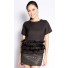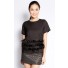 Crafted from mixed polyester, this top features round neckline, short sleeves, shoulder pads, back zipper closure and sewn on feather strips along the bottom.