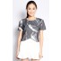Crafted from mixed polyester, this top features cropped styling, round neckline, short sleeves, shoulder pads, back zipper closure, asymmetrical hemline and marble print.