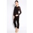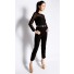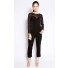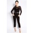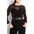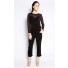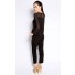 Crafted from mixed materials, this pantsuit features thigh-length, round neckline, mesh yoke and sleeves, front pockets, back cut out detail with button keyhole and zipper closure.