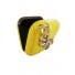 The clutch bag has been crafted from wood and leather. Details include structured square shape, magnetic clasp and gold chain accent across the clutch.